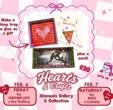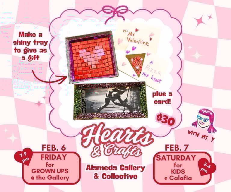 The world needs more love in it, so let's make a thoughtful, handmade gift to give to your valentine. Participants will make a special tray for keys, coins, rings, or anything they need to keep safe. We will use paint, disco stickers, letters, and other mixed media for the tray and also a card. All materials provided; no experience required. $30 each.